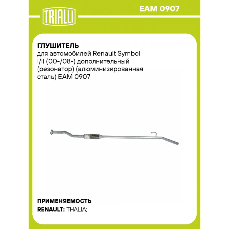 Глушитель для автомобилей Renault Symbol I/II (00-/08-) дополнительный (резонатор) (алюминизированная сталь) Характеристики: Артикул: EAM 0907 OEM номера: 8200043360 Количество на автомобиль: 1 Материал: Алюминизированная сталь Гарантийный срок: 2 года/60 тыс. Особенности конструкции:: Шумопоглощающая набивка E-GLASS Длина изделия (мм): 1986 Длина корпуса камеры (мм): 300 Форма изделия: Круг Диаметр перфор. трубы (мм): 45 Диаметр корпуса D-1 (мм): 76 Товарная линейка: BLACK Дополнительная информация: Этикетка изделия может отличаться от представленной на фото Сопутствующий товар: Глушители основные/глушители дополнительные (резонаторы): EMM 0902 Комплектация: Резонатор - 1 шт Гарантия: от 1 года.