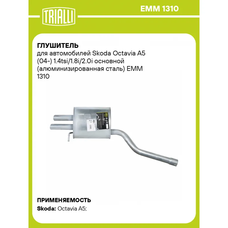 Глушитель для автомобилей Skoda Octavia A5 (04-) 1.4tsi/1.8i/2.0i основной (алюминизированная сталь) Характеристики: Артикул: EMM 1310 OEM номера: 1Z3253609AE, 1Z02531815 Количество на автомобиль: 1 Камеры корпуса: 3 Материал: Алюминизированная сталь Гарантийный срок: 2 года/60 тыс. Особенности конструкции:: Шумопоглощающая набивка E-GLASS Длина изделия (мм): 1040 Длина корпуса камеры (мм): 330 Форма изделия: Овал Диаметр перфор. трубы (мм): 51 Диаметр корпуса D-1 (мм): 280 Диаметр корпуса D-2 (мм): 165 Товарная линейка: BLACK Дополнительная информация: Этикетка изделия может отличаться от представленной на фото Сопутствующий товар: Глушители основные/глушители дополнительные (резонаторы): EAM 0343 Подходит для авто: Skoda Octavia A5 (04-), Octavia A5 (04-) Для проверки применяемости отправьте VIN автомобиля через вкладку "Есть вопросы о товаре?" Комплектация: Глушитель основной - 1 шт Гарантия: от 1 года.