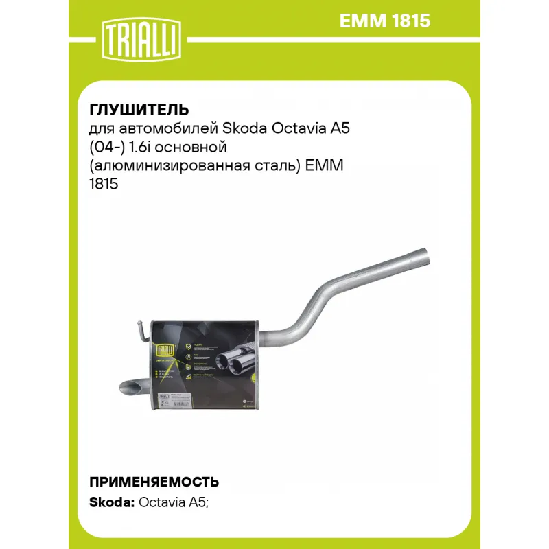 Глушитель для автомобилей Skoda Octavia A5 (04-) 1.6i основной (алюминизированная сталь) Характеристики: Артикул: EMM 1815 OEM номера: 1K5253609, 1Z0253609F Количество на автомобиль: 1 Камеры корпуса: 3 Материал: Алюминизированная сталь Гарантийный срок: 2 года/60 тыс. Особенности конструкции:: Шумопоглощающая набивка E-GLASS Длина изделия (мм): 980 Длина корпуса камеры (мм): 330 Форма изделия: Овал Диаметр перфор. трубы (мм): 51 Диаметр корпуса D-1 (мм): 280 Диаметр корпуса D-2 (мм): 165 Товарная линейка: BLACK Дополнительная информация: Этикетка изделия может отличаться от представленной на фото Сопутствующий товар: Глушители основные/глушители дополнительные (резонаторы): EAM 1801 Подходит для авто: Skoda Octavia A5 (04-) Для проверки применяемости отправьте VIN автомобиля через вкладку "Есть вопросы о товаре?" Комплектация: Глушитель основной - 1 шт Гарантия: от 1 года.