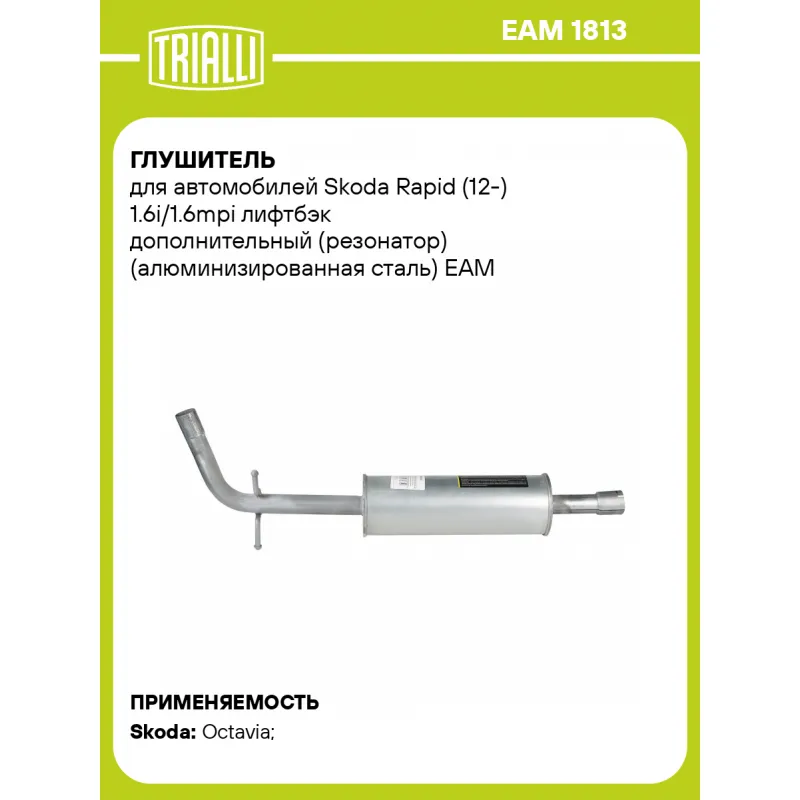 Глушитель для автомобилей Skoda Rapid (12-) 1.6i/1.6mpi лифтбэк дополнительный (резонатор) (алюминизированная сталь) Характеристики: Артикул: EAM 1813 OEM номера: 6RA253209N, 6RA253209S, 6RA253209E Особенности конструкции:: Шумопоглощающая набивка E-GLASS Гарантийный срок: 2 года/60 тыс. Количество на автомобиль: 1 Камеры корпуса: 1 Материал: Алюминизированная сталь Длина изделия (мм): 1005 Длина корпуса камеры (мм): 400 Форма изделия: Круг Диаметр перфор. трубы (мм): 45 Диаметр корпуса D-1 (мм): 138 Товарная линейка: BLACK Дополнительная информация: Этикетка изделия может отличаться от представленной на фото Подходит для авто: Skoda Octavia (96-) Для проверки применяемости отправьте VIN автомобиля через вкладку "Есть вопросы о товаре?" Комплектация: Резонатор - 1 шт Гарантия: от 1 года.