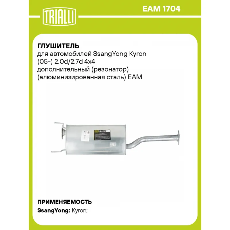 Глушитель для автомобилей SsangYong Kyron (05-) 2.0d/2.7d 4x4 дополнительный (резонатор) (алюминизированная сталь) Характеристики: Артикул: EAM 1704 OEM номера: 2440009161, 2440009162 Гарантийный срок: 2 года/60 тыс. Количество на автомобиль: 1 Камеры корпуса: 3 Материал: Алюминизированная сталь Особенности конструкции:: Шумопоглощающая набивка E-GLASS Длина изделия (мм): 1150 Длина корпуса камеры (мм): 550 Форма изделия: Овал Диаметр перфор. трубы (мм): 51 Диаметр корпуса D-1 (мм): 285 Диаметр корпуса D-2 (мм): 165 Товарная линейка: BLACK Дополнительная информация: Этикетка изделия может отличаться от представленной на фото Подходит для авто: SsangYong Kyron (05-) Для проверки применяемости отправьте VIN автомобиля через вкладку "Есть вопросы о товаре?" Комплектация: Резонатор - 1 шт Гарантия: от 1 года.