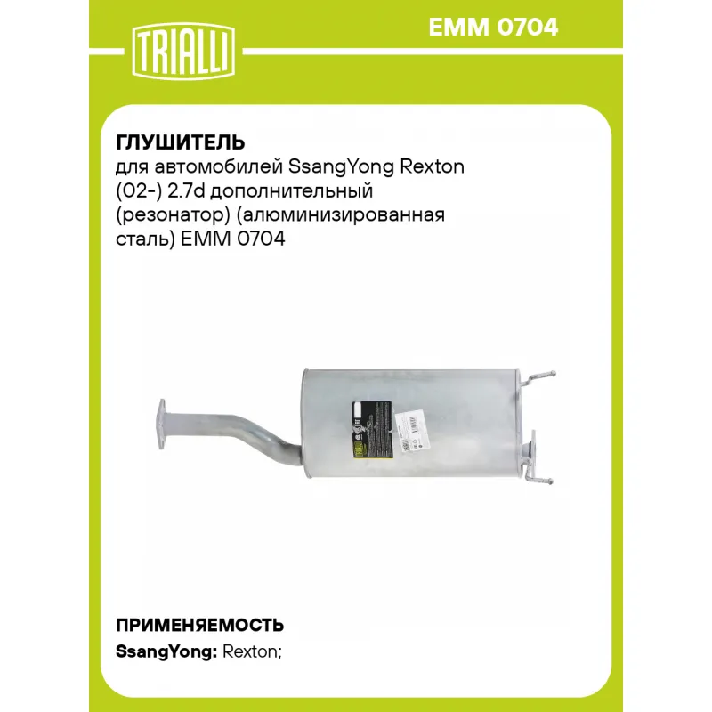 Глушитель для автомобилей SsangYong Rexton (02-) 2.7d дополнительный (резонатор) (алюминизированная сталь) Характеристики: Артикул: EMM 0704 OEM номера: 2440008142, 2440008143, 2440008640 Количество на автомобиль: 1 Камеры корпуса: 3 Материал: Алюминизированная сталь Гарантийный срок: 2 года/60 тыс. Особенности конструкции:: Шумопоглощающая набивка E-GLASS Длина изделия (мм): 1040 Длина корпуса камеры (мм): 550 Форма изделия: Овал Диаметр перфор. трубы (мм): 51 Диаметр корпуса D-1 (мм): 280 Диаметр корпуса D-2 (мм): 165 Товарная линейка: BLACK Дополнительная информация: Этикетка изделия может отличаться от представленной на фото Сопутствующий товар: Глушители основные/глушители дополнительные (резонаторы): EAM 0704 Подходит для авто: SsangYong Rexton (02-) Для проверки применяемости отправьте VIN автомобиля через вкладку "Есть вопросы о товаре?" Комплектация: Глушитель основной - 1 шт Гарантия: от 1 года.
