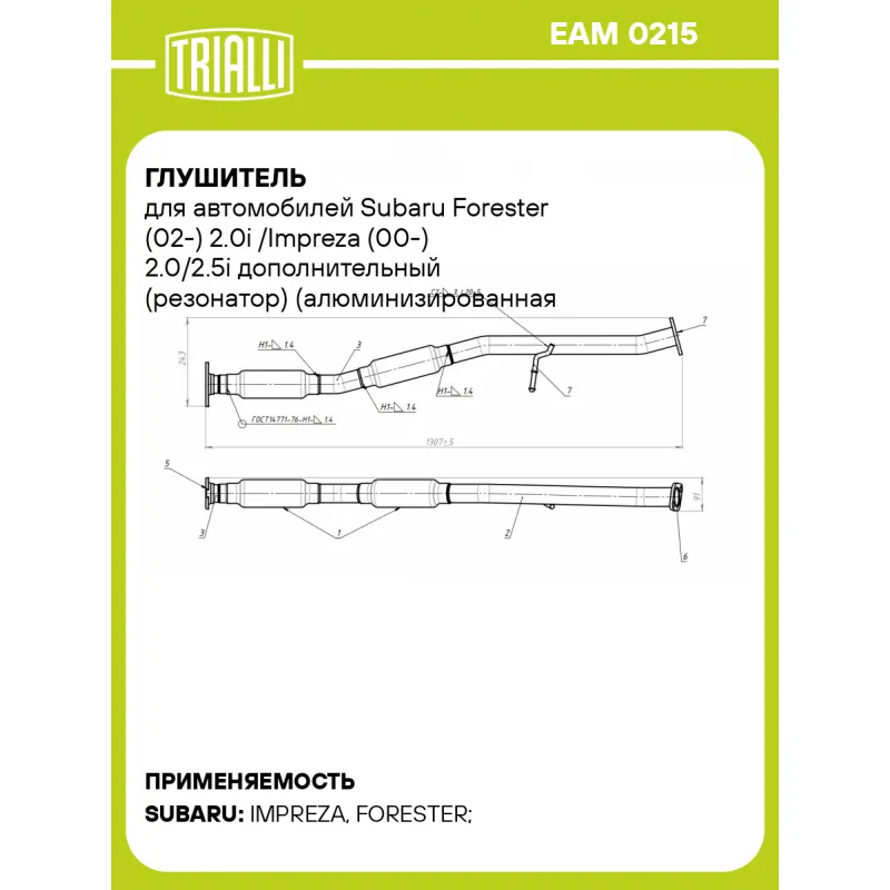 Глушитель для автомобилей Subaru Forester (02-) 2.0i /Impreza (00-) 2.0/2.5i дополнительный (резонатор) (алюминизированная сталь) Характеристики: Артикул: EAM 0215 OEM номера: 44200FE180, 44200-FE050 Особенности конструкции:: Шумопоглощающая набивка E-GLASS Гарантийный срок: 2 года/60 тыс. Количество на автомобиль: 1 Камеры корпуса: 1+1 Материал: Алюминизированная сталь Длина изделия (мм): 1307 Длина корпуса камеры (мм): 255 Форма изделия: Круг Диаметр корпуса D-1 (мм): 76 Товарная линейка: BLACK Дополнительная информация: Этикетка изделия может отличаться от представленной на фото Комплектация: Резонатор со стронгером - 1 шт Гарантия: от 1 года.