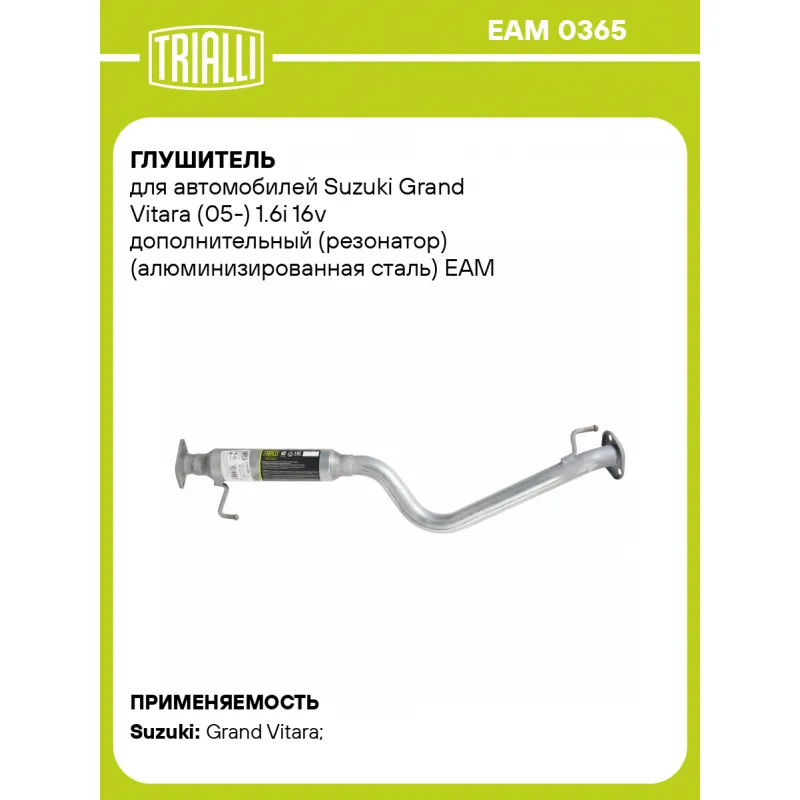 Глушитель для автомобилей Suzuki Grand Vitara (05-) 1.6i 16v дополнительный (резонатор) (алюминизированная сталь) Характеристики: Артикул: EAM 0365 OEM номера: 14260-64J00, 14260-64J00-000 Количество на автомобиль: 1 Камеры корпуса: 1 Материал: Алюминизированная сталь Гарантийный срок: 2 года/60 тыс. Особенности конструкции:: Шумопоглощающая набивка E-GLASS Длина изделия (мм): 1118 Длина корпуса камеры (мм): 400 Форма изделия: Круг Диаметр перфор. трубы (мм): 54 Диаметр корпуса D-1 (мм): 89 Товарная линейка: BLACK Дополнительная информация: Этикетка изделия может отличаться от представленной на фото Сопутствующий товар: Глушители основные/глушители дополнительные (резонаторы): EMM 0364 Подходит для авто: Suzuki Grand Vitara (05-) Для проверки применяемости отправьте VIN автомобиля через вкладку "Есть вопросы о товаре?" Комплектация: Резонатор - 1 шт Гарантия: от 1 года.