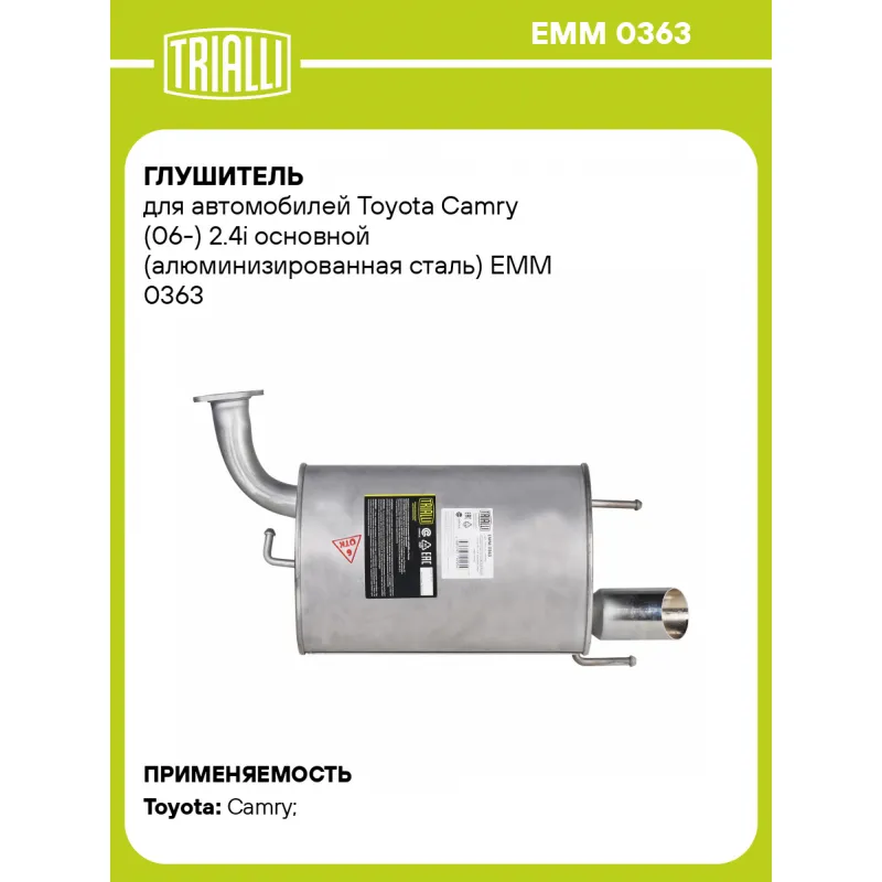 Глушитель для автомобилей Toyota Camry (06-) 2.4i основной (алюминизированная сталь) Характеристики: Артикул: EMM 0363 OEM номера: 1743028720 Количество на автомобиль: 1 Камеры корпуса: 3 Материал: Алюминизированная сталь Гарантийный срок: 2 года/60 тыс. Особенности конструкции:: Шумопоглощающая набивка E-GLASS Длина изделия (мм): 685 Длина корпуса камеры (мм): 415 Форма изделия: Овал Диаметр перфор. трубы (мм): 51 Диаметр корпуса D-1 (мм): 280 Диаметр корпуса D-2 (мм): 165 Товарная линейка: BLACK Дополнительная информация: Этикетка изделия может отличаться от представленной на фото Сопутствующий товар: Глушители основные/глушители дополнительные (резонаторы): EAM 0363 Сопутствующий товар: Трубы газоприемные: ERP 0363 Подходит для авто: Toyota Camry (06-) Для проверки применяемости отправьте VIN автомобиля через вкладку "Есть вопросы о товаре?" Комплектация: Глушитель основной - 1 шт Гарантия: от 1 года.