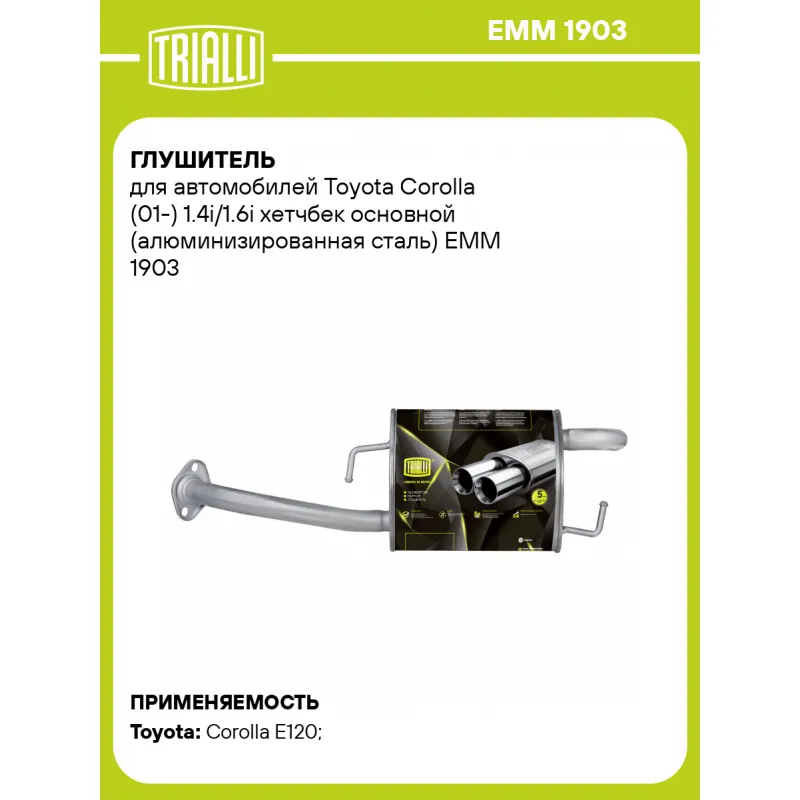 Глушитель для автомобилей Toyota Corolla (01-) 1.4i/1.6i хетчбек основной (алюминизированная сталь) Характеристики: Артикул: EMM 1903 OEM номера: 1743022240, 174300D140, 1743022420 Количество на автомобиль: 1 Камеры корпуса: 3 Материал: Алюминизированная сталь Гарантийный срок: 2 года/60 тыс. Особенности конструкции:: Шумопоглощающая набивка E-GLASS Длина изделия (мм): 850 Длина корпуса камеры (мм): 330 Форма изделия: Овал Диаметр перфор. трубы (мм): 45 Диаметр корпуса D-1 (мм): 280 Диаметр корпуса D-2 (мм): 165 Товарная линейка: BLACK Дополнительная информация: Этикетка изделия может отличаться от представленной на фото Сопутствующий товар: Глушители основные/глушители дополнительные (резонаторы): EAM 0362 Подходит для авто: Toyota Corolla E120 (01-) Для проверки применяемости отправьте VIN автомобиля через вкладку "Есть вопросы о товаре?" Комплектация: Глушитель основной - 1 шт Гарантия: от 1 года.
