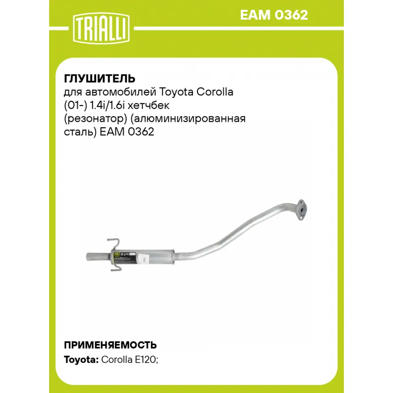 Глушитель для автомобилей Toyota Corolla (01-) 1.4i/1.6i хетчбек (резонатор) (алюминизированная сталь) Характеристики: Артикул: EAM 0362 OEM номера: 17410-0D330, 17410-22490 Количество на автомобиль: 1 Камеры корпуса: 1 Материал: Алюминизированная сталь Гарантийный срок: 2 года/60 тыс. Особенности конструкции:: Шумопоглощающая набивка E-GLASS Длина изделия (мм): 1400 Длина корпуса камеры (мм): 410 Форма изделия: Круг Диаметр перфор. трубы (мм): 51 Диаметр корпуса D-1 (мм): 101 Товарная линейка: BLACK Дополнительная информация: Этикетка изделия может отличаться от представленной на фото Сопутствующий товар: Глушители основные/глушители дополнительные (резонаторы): EMM 1903 Подходит для авто: Toyota Corolla E120 (01-) Для проверки применяемости отправьте VIN автомобиля через вкладку "Есть вопросы о товаре?" Комплектация: Резонатор - 1 шт Гарантия: от 1 года.