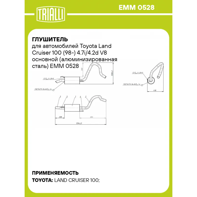 Глушитель для автомобилей Toyota Land Cruiser 100 (98-) 4.7i/4.2d V8 основной (алюминизированная сталь) Характеристики: Артикул: EMM 0528 OEM номера: 1740550030 Особенности конструкции:: Шумопоглощающая набивка E-GLASS Гарантийный срок: 2 года/60 тыс. Диаметр перфор. трубы (мм): 63,5 Количество на автомобиль: 1 Камеры корпуса: 3 Материал: Алюминизированная сталь Длина изделия (мм): 1314 Длина корпуса камеры (мм): 390 Форма изделия: Круг Диаметр корпуса D-1 (мм): 187,5 Товарная линейка: BLACK Дополнительная информация: Этикетка изделия может отличаться от представленной на фото Комплектация: Глушитель основной - 1 шт Гарантия: от 1 года.