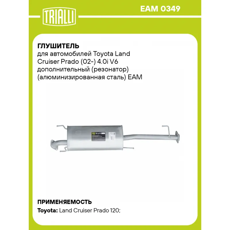 Глушитель для автомобилей Toyota Land Cruiser Prado (02-) 4.0i V6 дополнительный (резонатор) (алюминизированная сталь) Характеристики: Артикул: EAM 0349 OEM номера: 17420-50220 Гарантийный срок: 2 года/60 тыс. Количество на автомобиль: 1 Камеры корпуса: 5 Материал: Алюминизированная сталь Особенности конструкции:: Шумопоглощающая набивка E-GLASS Длина изделия (мм): 1400 Длина корпуса камеры (мм): 600 Форма изделия: Овал Диаметр перфор. трубы (мм): 51 Диаметр корпуса D-1 (мм): 280 Диаметр корпуса D-2 (мм): 165 Товарная линейка: BLACK Дополнительная информация: Этикетка изделия может отличаться от представленной на фото Подходит для авто: Toyota Land Cruiser Prado 120 (02-) Для проверки применяемости отправьте VIN автомобиля через вкладку "Есть вопросы о товаре?" Комплектация: Резонатор - 1 шт Гарантия: от 1 года.