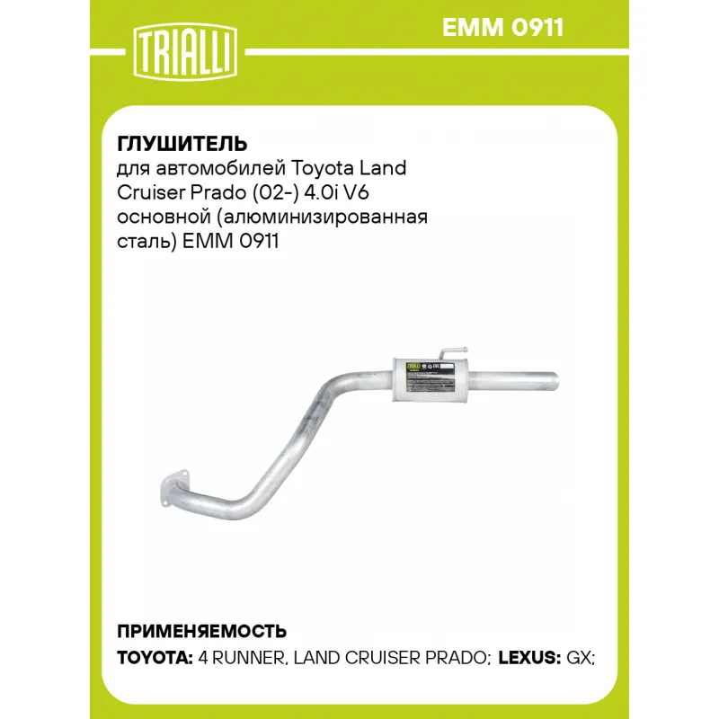 Глушитель для автомобилей Toyota Land Cruiser Prado (02-) 4.0i V6 основной (алюминизированная сталь) Характеристики: Артикул: EMM 0911 OEM номера: 1743031410 Материал: Алюминизированная сталь Особенности конструкции:: Шумопоглощающая набивка Гарантийный срок: 2 года/60 тыс. Длина изделия (мм): 1205 Форма изделия: Круг Диаметр корпуса D-1 (мм): 138 Длина корпуса камеры (мм): 225 Диаметр перфор. трубы (мм): 63,5 Количество на автомобиль: 1 Камеры корпуса: 1 Товарная линейка: BLACK Дополнительная информация: Этикетка изделия может отличаться от представленной на фото Комплектация: Глушитель основной - 1 шт Гарантия: от 1 года.