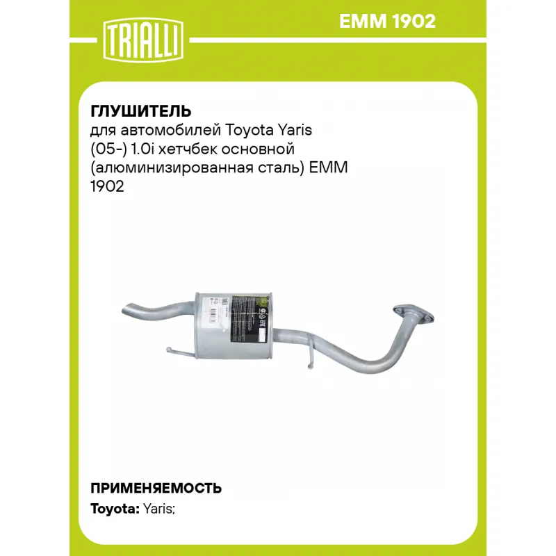 Глушитель для автомобилей Toyota Yaris (05-) 1.0i хетчбек основной (алюминизированная сталь) Характеристики: Артикул: EMM 1902 OEM номера: 17430-40051, 1743040050, 174300Q020 Особенности конструкции:: Шумопоглощающая набивка E-Glass Гарантийный срок: 2 года/60 тыс. Количество на автомобиль: 1 Камеры корпуса: 3 Материал: Алюминизированная сталь Длина изделия (мм): 827 Длина корпуса камеры (мм): 205 Форма изделия: Круг Диаметр перфор. трубы (мм): 45 Диаметр корпуса D-1 (мм): 190 Товарная линейка: BLACK Дополнительная информация: Этикетка изделия может отличаться от представленной на фото Подходит для авто: Toyota Yaris (05-) Для проверки применяемости отправьте VIN автомобиля через вкладку "Есть вопросы о товаре?" Комплектация: Глушитель основной - 1 шт Гарантия: от 1 года.
