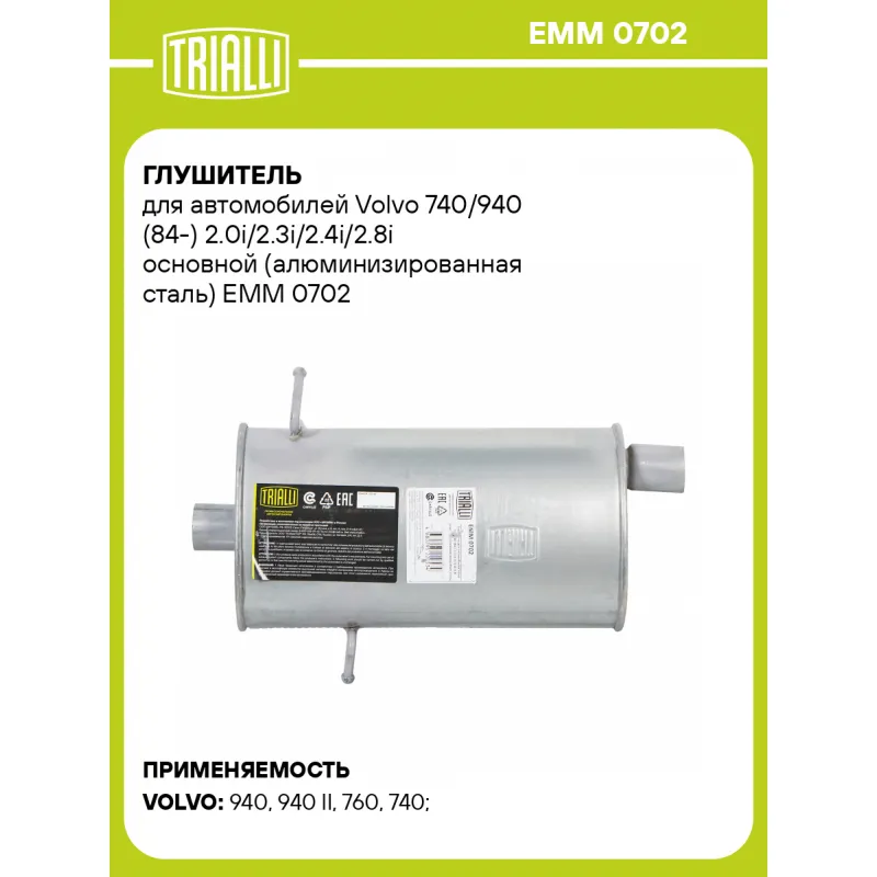 Глушитель для автомобилей Volvo 740/940 (84-) 2.0i/2.3i/2.4i/2.8i основной (алюминизированная сталь) Характеристики: Артикул: EMM 0702 OEM номера: 1357068, 3531670 Особенности конструкции:: Шумопоглощающая набивка E-GLASS Гарантийный срок: 2 года/60 тыс. Количество на автомобиль: 1 Камеры корпуса: 3 Материал: Алюминизированная сталь Длина изделия (мм): 519 Длина корпуса камеры (мм): 410 Форма изделия: Овал Диаметр перфор. трубы (мм): 45 Диаметр корпуса D-1 (мм): 221 Диаметр корпуса D-2 (мм): 131 Товарная линейка: BLACK Дополнительная информация: Этикетка изделия может отличаться от представленной на фото Комплектация: Глушитель основной - 1 шт Гарантия: от 1 года.
