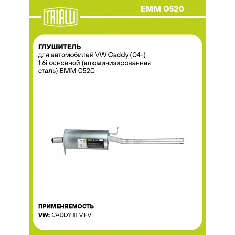 Глушитель для автомобилей VW Caddy (04-) 1.6i основной (алюминизированная сталь) Характеристики: Артикул: EMM 0520 OEM номера: 2K0253609A, 2K0253609M, 2K0253609AD Особенности конструкции:: Шумопоглощающая набивка E-Glass Гарантийный срок: 2 года/60 тыс. Количество на автомобиль: 1 Камеры корпуса: 3 Материал: Алюминизированная сталь Длина изделия (мм): 1200 Длина корпуса камеры (мм): 393 Форма изделия: Круг Диаметр перфор. трубы (мм): 51 Диаметр корпуса D-1 (мм): 190 Товарная линейка: BLACK Дополнительная информация: Этикетка изделия может отличаться от представленной на фото Комплектация: Глушитель основной - 1 шт Гарантия: от 1 года.