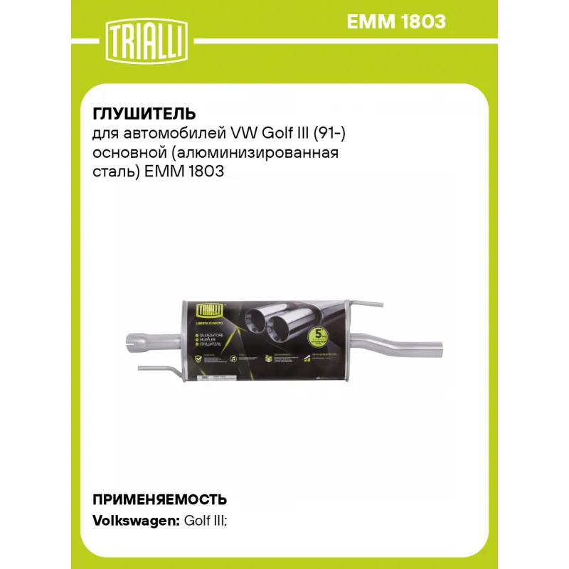 Глушитель для автомобилей VW Golf III (91-) основной (алюминизированная сталь) Характеристики: Артикул: EMM 1803 OEM номера: 1H6253609A, 1H6253609AD, 1H6253609G, 1H6253609P, JZW253609AR, 1H6253609AE, 1H6253609T Количество на автомобиль: 1 Камеры корпуса: 3 Материал: Алюминизированная сталь Гарантийный срок: 2 года/60 тыс. Особенности конструкции:: Шумопоглощающая набивка E-GLASS Длина изделия (мм): 865 Длина корпуса камеры (мм): 445 Форма изделия: Овал Диаметр перфор. трубы (мм): 45 Диаметр корпуса D-1 (мм): 221 Диаметр корпуса D-2 (мм): 131 Товарная линейка: BLACK Дополнительная информация: Этикетка изделия может отличаться от представленной на фото Сопутствующий товар: Трубы газоприемные: ECP 1803 Подходит для авто: Volkswagen Golf III (91-) Для проверки применяемости отправьте VIN автомобиля через вкладку "Есть вопросы о товаре?" Комплектация: Глушитель основной - 1 шт Гарантия: от 1 года.