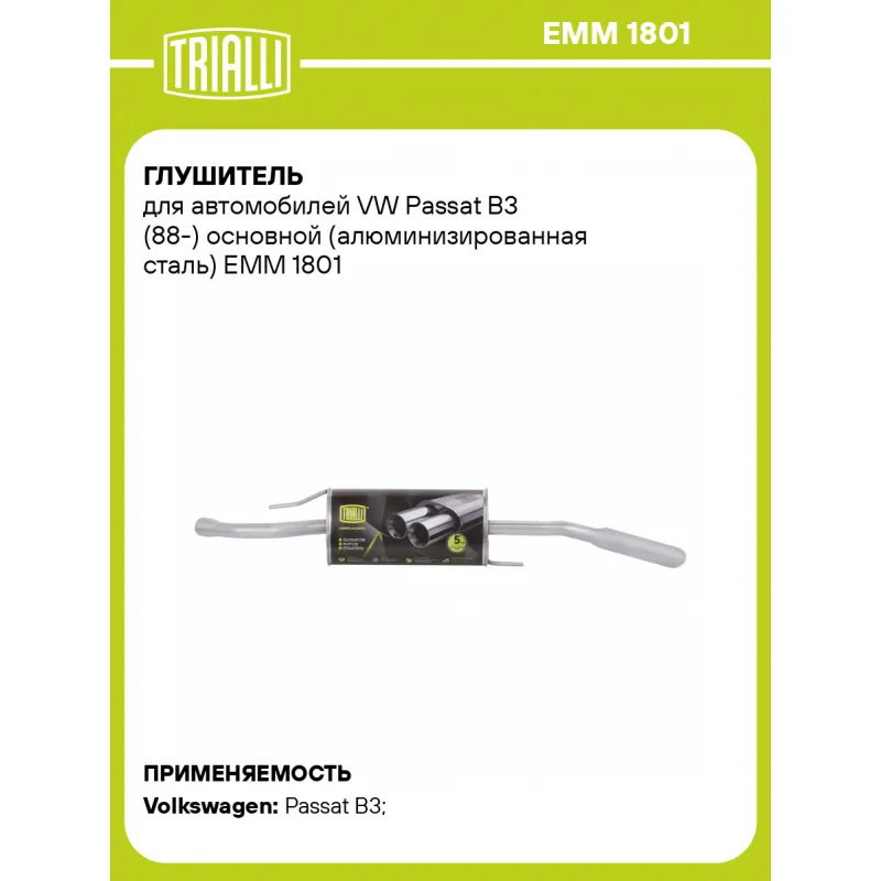 Глушитель для автомобилей VW Passat B3 (88-) основной (алюминизированная сталь) Характеристики: Артикул: EMM 1801 OEM номера: 357253609A, 357253609M, 357253609H Количество на автомобиль: 1 Камеры корпуса: 3 Материал: Алюминизированная сталь Гарантийный срок: 2 года/60 тыс. Особенности конструкции:: Шумопоглощающая набивка E-GLASS Длина изделия (мм): 1370 Длина корпуса камеры (мм): 445 Форма изделия: Овал Диаметр перфор. трубы (мм): 45 Диаметр корпуса D-1 (мм): 221 Диаметр корпуса D-2 (мм): 131 Товарная линейка: BLACK Дополнительная информация: Этикетка изделия может отличаться от представленной на фото Сопутствующий товар: Глушители основные/глушители дополнительные (резонаторы): EAM 1806 Сопутствующий товар: Трубы газоприемные: ECP 1803 Подходит для авто: Volkswagen Passat B3 (88-) Для проверки применяемости отправьте VIN автомобиля через вкладку "Есть вопросы о товаре?" Комплектация: Глушитель основной - 1 шт Гарантия: от 1 года.