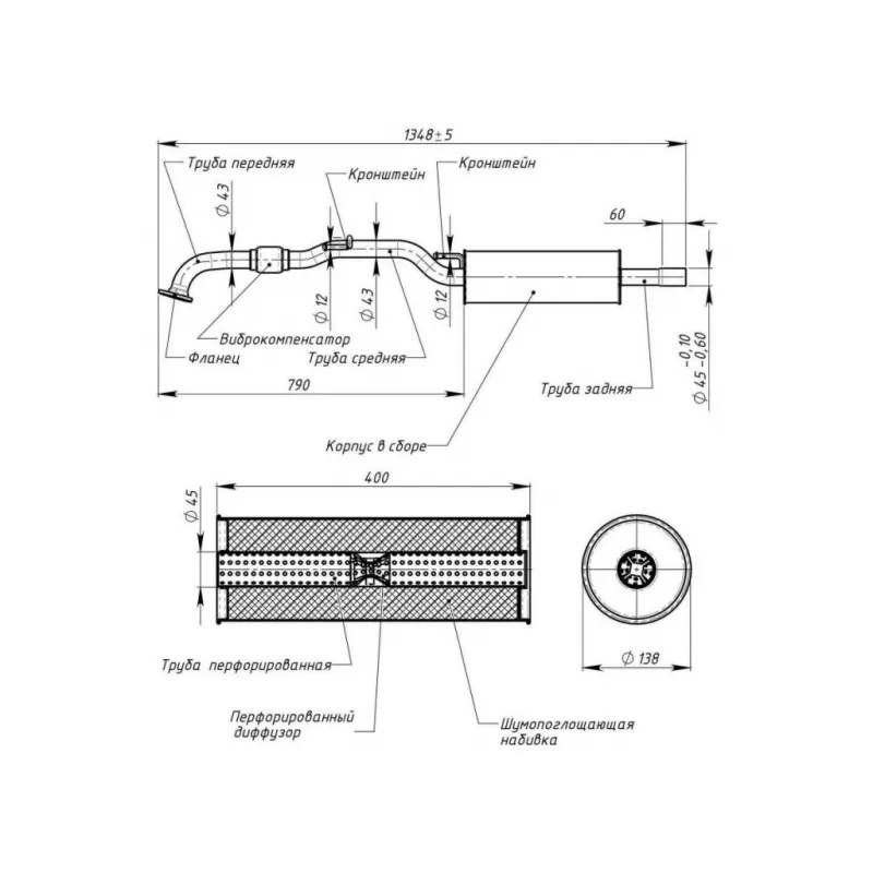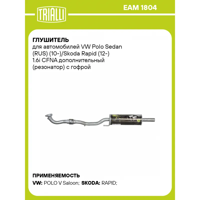 Глушитель для автомобилей VW Polo Sedan (RUS) (10-)/Skoda Rapid (12-) 1.6i CFNA дополнительный (резонатор) с гофрой (алюминизированная сталь) Характеристики: Артикул: EAM 1804 OEM номера: 6RU253211, 6RU253091, 6RU253091C, 6RU253091B Количество на автомобиль: 1 Камеры корпуса: 1 Материал: Алюминизированная сталь Гарантийный срок: 2 года/60 тыс. Особенности конструкции:: Шумопоглощающая набивка E-GLASS Длина изделия (мм): 1348 Длина корпуса камеры (мм): 400 Форма изделия: Круг Диаметр перфор. трубы (мм): 45 Диаметр корпуса D-1 (мм): 138 Товарная линейка: BLACK Дополнительная информация: Этикетка изделия может отличаться от представленной на фото Сопутствующий товар: Глушители основные/глушители дополнительные (резонаторы): EMM 1807 Сопутствующий товар: Трубы газоприемные: ECP 1801 Комплектация: Резонатор с виброкомпенсатором - 1 шт Гарантия: от 1 года.