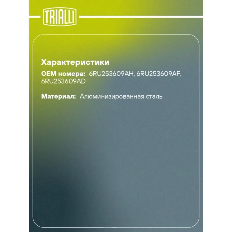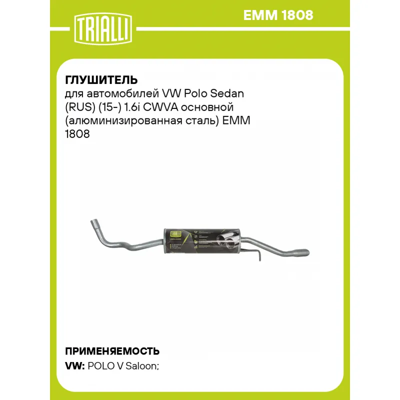 Глушитель для автомобилей VW Polo Sedan (RUS) (15-) 1.6i CWVA основной (алюминизированная сталь) Характеристики: Артикул: EMM 1808 OEM номера: 6RU253609AH, 6RU253609AF, 6RU253609AD Количество на автомобиль: 1 Камеры корпуса: 3 Материал: Алюминизированная сталь Гарантийный срок: 2 года/60 тыс. Особенности конструкции:: Шумопоглощающая набивка E-GLASS Длина изделия (мм): 1600 Длина корпуса камеры (мм): 540 Форма изделия: Круг Диаметр перфор. трубы (мм): 45 Диаметр корпуса D-1 (мм): 190 Товарная линейка: BLACK Дополнительная информация: Этикетка изделия может отличаться от представленной на фото Сопутствующий товар: Глушители основные/глушители дополнительные (резонаторы): EAM 1805 Комплектация: Глушитель основной - 1 шт Гарантия: от 1 года.