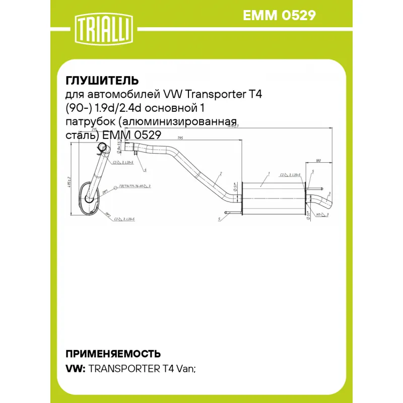 Глушитель для автомобилей VW Transporter T4 (90-) 1.9d/2.4d основной 1 патрубок (алюминизированная сталь) Характеристики: Артикул: EMM 0529 OEM номера: 028253609B, 028253609F, 044253609K, 074253609K, JZW253609BD, 044253609AD, 074253609AB Особенности конструкции:: Шумопоглощающая набивка E-GLASS Гарантийный срок: 2 года/60 тыс. Диаметр перфор. трубы (мм): 51 Количество на автомобиль: 1 Камеры корпуса: 3 Материал: Алюминизированная сталь Длина изделия (мм): 1410 Длина корпуса камеры (мм): 434 Форма изделия: Овал Диаметр корпуса D-1 (мм): 221 Диаметр корпуса D-2 (мм): 131 Товарная линейка: BLACK Дополнительная информация: Этикетка изделия может отличаться от представленной на фото Комплектация: Глушитель основной - 1 шт Гарантия: от 1 года.