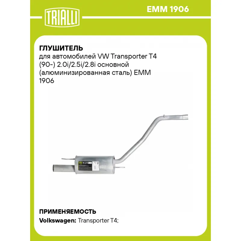 Глушитель для автомобилей VW Transporter T4 (90-) 2.0i/2.5i/2.8i основной (алюминизированная сталь) Характеристики: Артикул: EMM 1906 OEM номера: 044253609AH, 7D0253609C, JZW253609BB Гарантийный срок: 2 года/60 тыс. Количество на автомобиль: 1 Камеры корпуса: 3 Материал: Алюминизированная сталь Особенности конструкции:: Шумопоглощающая набивка E-GLASS Длина изделия (мм): 1500 Длина корпуса камеры (мм): 415 Форма изделия: Овал Диаметр перфор. трубы (мм): 51 Диаметр корпуса D-1 (мм): 195 Диаметр корпуса D-2 (мм): 165 Товарная линейка: BLACK Дополнительная информация: Этикетка изделия может отличаться от представленной на фото Сопутствующий товар: Трубы газоприемные: ERP 1615, ECP 1802 Подходит для авто: Volkswagen Transporter T4 (90-) Для проверки применяемости отправьте VIN автомобиля через вкладку "Есть вопросы о товаре?" Комплектация: Глушитель основной - 1 шт Гарантия: от 1 года.