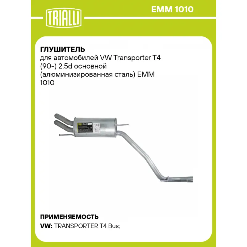Глушитель для автомобилей VW Transporter T4 (90-) 2.5d основной (алюминизированная сталь) Характеристики: Артикул: EMM 1010 OEM номера: JZW253609BP, 074253609AL, 7D0253609 Особенности конструкции:: Шумопоглощающая набивка E-GLASS Гарантийный срок: 2 года/60 тыс. Количество на автомобиль: 1 Камеры корпуса: 3 Материал: Алюминизированная сталь Длина изделия (мм): 1455 Длина корпуса камеры (мм): 426 Форма изделия: Овал Диаметр перфор. трубы (мм): 51 Диаметр корпуса D-1 (мм): 212 Диаметр корпуса D-2 (мм): 182 Товарная линейка: BLACK Дополнительная информация: Этикетка изделия может отличаться от представленной на фото Комплектация: Глушитель основной - 1 шт Гарантия: от 1 года.