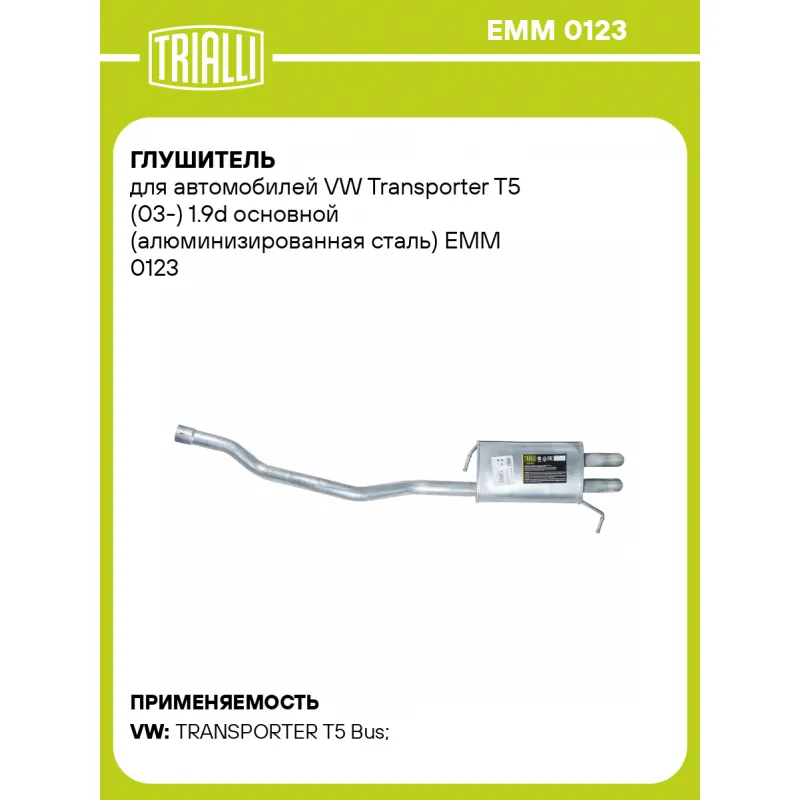 Глушитель для автомобилей VW Transporter T5 (03-) 1.9d основной (алюминизированная сталь) Характеристики: Артикул: EMM 0123 OEM номера: 7H0253609AC, 7H0253609AH, 7H0253609J, 7H0253609AS Особенности конструкции:: Шумопоглощающая набивка E-GLASS Гарантийный срок: 2 года/60 тыс. Количество на автомобиль: 1 Камеры корпуса: 3 Материал: Алюминизированная сталь Длина изделия (мм): 1565 Длина корпуса камеры (мм): 370 Форма изделия: Овал Диаметр корпуса D-1 (мм): 219 Диаметр корпуса D-2 (мм): 129 Товарная линейка: BLACK Дополнительная информация: Этикетка изделия может отличаться от представленной на фото Комплектация: Глушитель основной - 1 шт Гарантия: от 1 года.