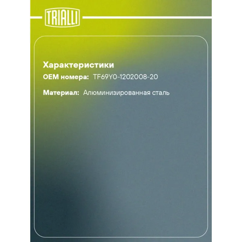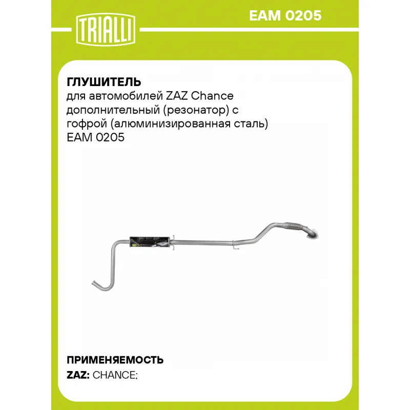 Глушитель для автомобилей ZAZ Chance дополнительный (резонатор) с гофрой (алюминизированная сталь) Характеристики: Артикул: EAM 0205 OEM номера: TF69Y0-1202008-20 Количество на автомобиль: 1 Камеры корпуса: 3 Материал: Алюминизированная сталь Гарантийный срок: 2 года/60 тыс. Особенности конструкции:: Шумопоглощающая набивка E-GLASS Длина изделия (мм): 2500 Длина корпуса камеры (мм): 450 Форма изделия: Овал Диаметр перфор. трубы (мм): 45 Диаметр корпуса D-1 (мм): 120 Диаметр корпуса D-2 (мм): 87 Товарная линейка: BLACK Дополнительная информация: Этикетка изделия может отличаться от представленной на фото Сопутствующий товар: Глушители основные/глушители дополнительные (резонаторы): EMM 0205 Комплектация: Резонатор с виброкомпенсатором - 1 шт Гарантия: от 1 года.