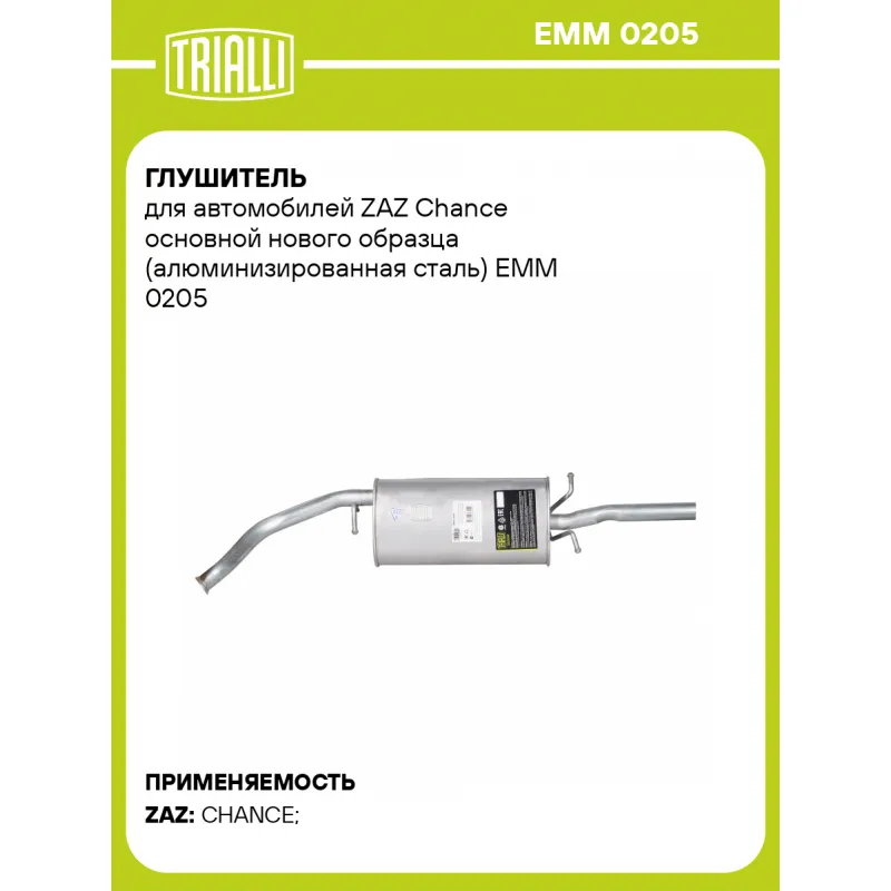 Глушитель для автомобилей ZAZ Chance основной нового образца (алюминизированная сталь) Характеристики: Артикул: EMM 0205 OEM номера: TF69Y0120100920 Количество на автомобиль: 1 Камеры корпуса: 3 Материал: Алюминизированная сталь Гарантийный срок: 2 года/60 тыс. Особенности конструкции:: Шумопоглощающая набивка E-GLASS Длина изде... Читать полностью →