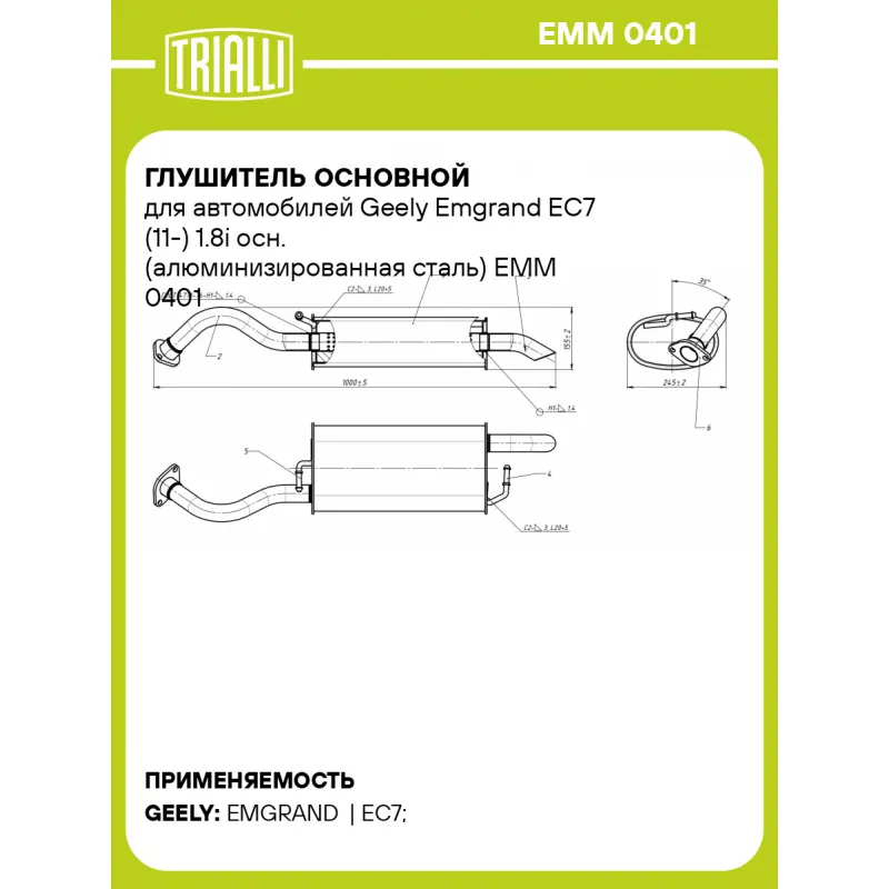 Глушитель основной для автомобилей Geely Emgrand EC7 (11-) 1.8i осн. (алюминизированная сталь) Характеристики: Артикул: EMM 0401 OEM номера: 1064001081 Особенности конструкции:: Шумопоглощающая набивка E-GLASS Гарантийный срок: 2 года/60 тыс. Количество на автомобиль: 1 Камеры корпуса: 3 Материал: Алюминизированная сталь Длина изделия (мм): 1000 Длина корпуса камеры (мм): 434 Форма изделия: Овал Диаметр перфор. трубы (мм): 45 Диаметр корпуса D-1 (мм): 221 Диаметр корпуса D-2 (мм): 131 Товарная линейка: BLACK Дополнительная информация: Этикетка изделия может отличаться от представленной на фото Комплектация: Глушитель основной - 1 шт Гарантия: от 1 года.