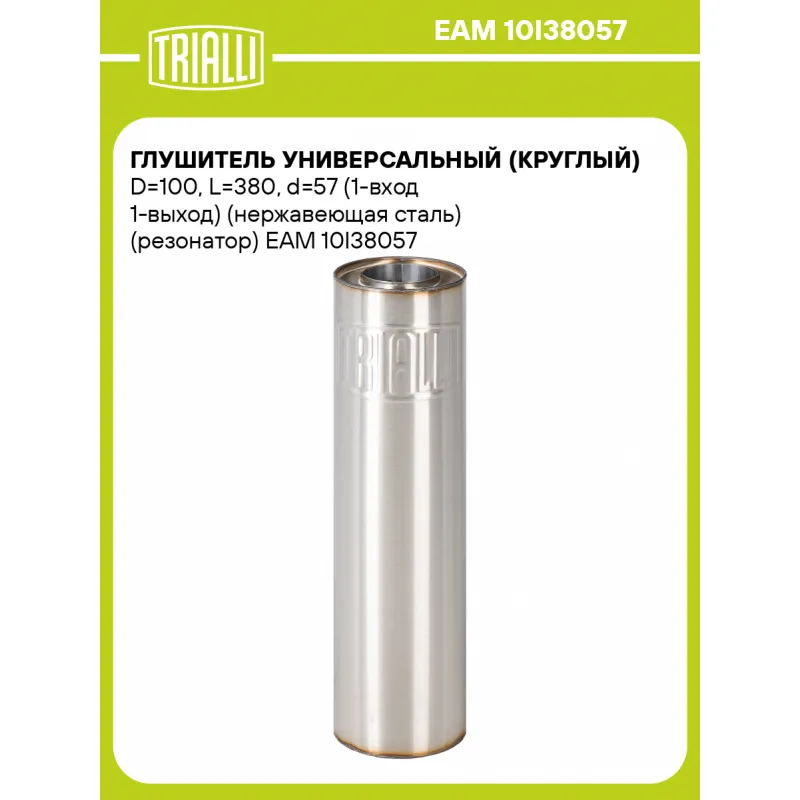 Глушитель универсальный (круглый) D=100, L=380, d=57 (1-вход 1-выход) (нержавеющая сталь) (резонатор) Характеристики: Артикул: EAM 10I38057 OEM номера: 10I38057 Особенности конструкции:: Набивка жаро-шумопоглощающая Гарантийный срок: 2 года/60 тыс. Количество на автомобиль: 1 Длина изделия (мм): 380 Форма изделия: Круг Диаметр к... Читать полностью →