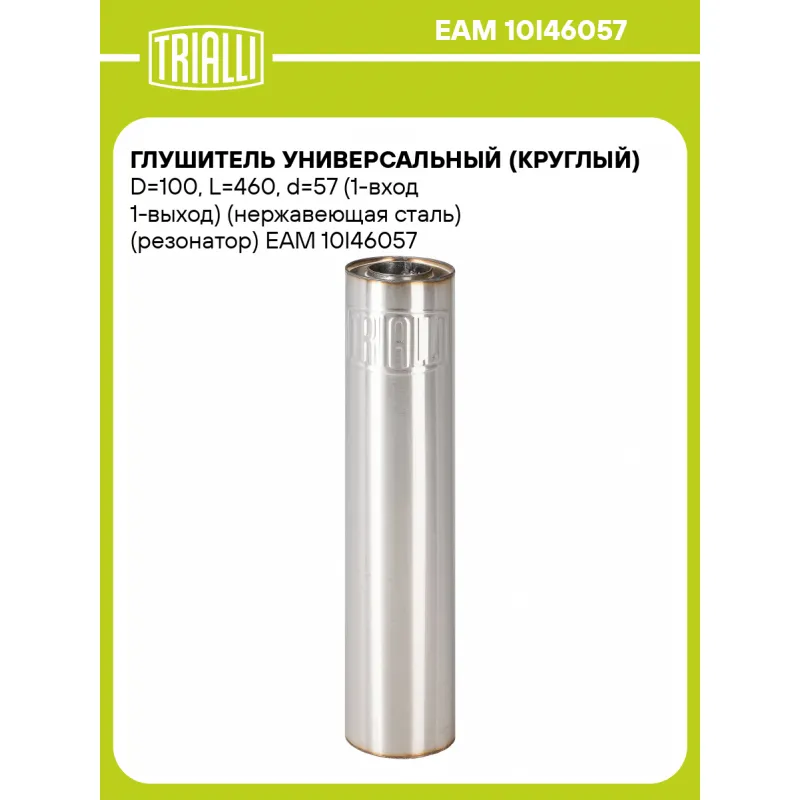 Глушитель универсальный (круглый) D=100, L=460, d=57 (1-вход 1-выход) (нержавеющая сталь) (резонатор) Характеристики: Артикул: EAM 10I46057 OEM номера: 10I46057 Особенности конструкции:: Набивка жаро-шумопоглощающая Гарантийный срок: 2 года/60 тыс. Количество на автомобиль: 1 Длина изделия (мм): 460 Форма изделия: Круг Диаметр к... Читать полностью →
