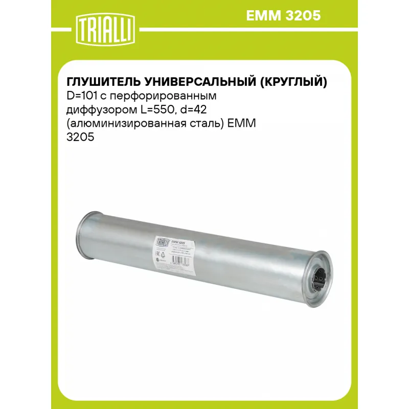 Глушитель универсальный (круглый) D=101 с перфорированным диффузором L=550, d=42 (алюминизированная сталь) Характеристики: Артикул: EMM 3205 OEM номера: 11180120002000, 2108-1202005, 21080120002081, 21080120002083, 21082-1200020, 21082120002000, 21144-1200020-00, 2170-1200020, 21700120002081, 21700120002083, 2170120002000, 2123-1200018-20, 21214-1200020-22, 21144-1200020, 21144120002081, 21144120002083, 21214-1200020-20, 21214-1200020-81, 21214120002083, 21082120002081, 21082120002083, 21082-120002001, 2110-1206010, 21084120002081, 21084120002083, 21313120002042 Гарантийный срок: 2 года/60 тыс. Количество на автомобиль: 1 Длина изделия (мм): 550 Особенности конструкции:: Шумопоглощающая набивка E-GLASS Форма изделия: Круг Диаметр корпуса D-1 (мм): 101 Диаметр трубы (мм): 42 Материал: Алюминизированная сталь Товарная линейка: BLACK Дополнительная информация: Этикетка изделия может отличаться от представленной на фото Комплектация: Глушитель универсальный - 1 шт Гарантия: от 1 года.