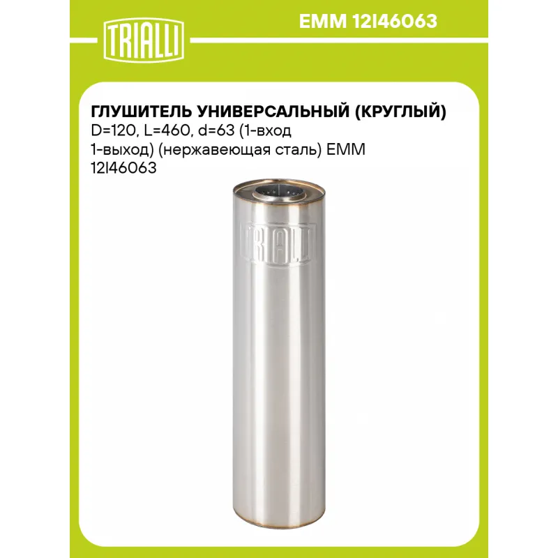 Глушитель универсальный (круглый) D=120, L=460, d=63 (1-вход 1-выход) (нержавеющая сталь) Характеристики: Артикул: EMM 12I46063 OEM номера: 12I46063 Особенности конструкции:: Набивка жаро-шумопоглощающая Гарантийный срок: 2 года/60 тыс. Количество на автомобиль: 1 Длина изделия (мм): 460 Форма изделия: Круг Диаметр корпуса D-1 (... Читать полностью →
