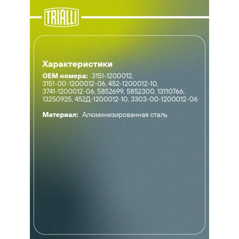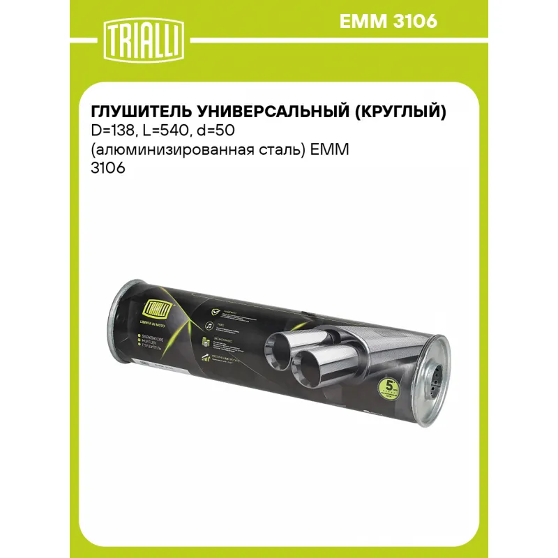 Глушитель универсальный (круглый) D=138, L=540, d=50 (алюминизированная сталь) Характеристики: Артикул: EMM 3106 OEM номера: 3151-1200012, 3151-00-1200012-06, 452-1200012-10, 3741-1200012-06, 5852699, 5852300, 13110766, 13250925, 452Д-1200012-10, 3303-00-1200012-06, 3303-00-1200012-206, 3303-1200012, 33031-2000122-06, 1064001080, 20300JN00B Гарантийный срок: 2 года/60 тыс. Количество на автомобиль: 1 Длина изделия (мм): 540 Особенности конструкции:: Шумопоглощающая набивка E-GLASS Форма изделия: Круг Диаметр корпуса D-1 (мм): 138 Диаметр трубы (мм): 50 Материал: Алюминизированная сталь Товарная линейка: BLACK Дополнительная информация: Этикетка изделия может отличаться от представленной на фото Комплектация: Глушитель универсальный - 1 шт Гарантия: от 1 года.