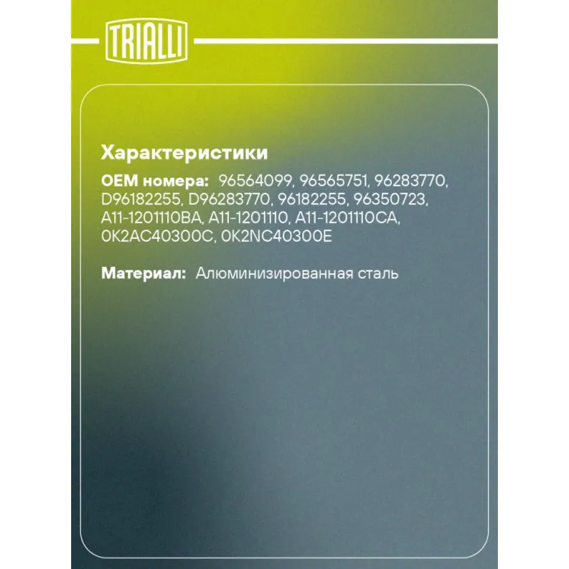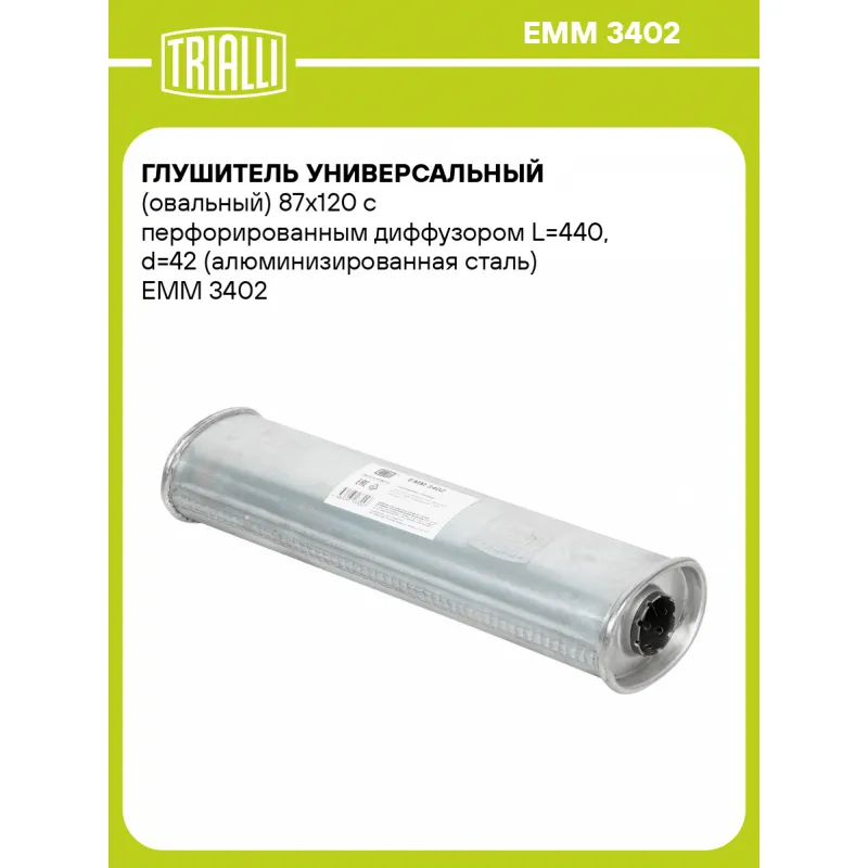 Глушитель универсальный (овальный) 87х120 с перфорированным диффузором L=440, d=42 (алюминизированная сталь) Характеристики: Артикул: EMM 3402 OEM номера: 96564099, 96565751, 96283770, D96182255, D96283770, 96182255, 96350723, A11-1201110BA, A11-1201110, A11-1201110CA, 0K2AC40300C, 0K2NC40300E, 96351601, 96350080, 96283769 Гаран... Читать полностью →