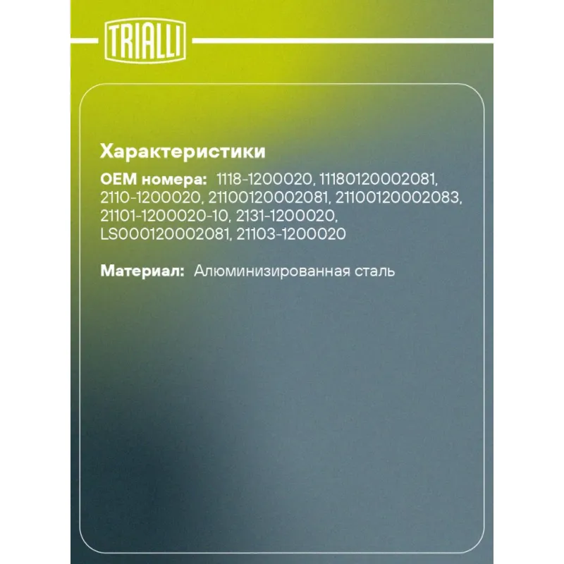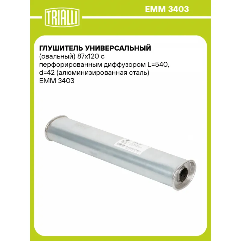 Глушитель универсальный (овальный) 87х120 с перфорированным диффузором L=540, d=42 (алюминизированная сталь) Характеристики: Артикул: EMM 3403 OEM номера: 1118-1200020, 11180120002081, 2110-1200020, 21100120002081, 21100120002083, 21101-1200020-10, 2131-1200020, LS000120002081, 21103-1200020, 21103120002081, 21103120002083, 21101-1200020-30, 21313-1200020-30, 21313-1200020, 21102120002083, 2121-1202005, 21213-1200020, 21214-1200020-00, 2123-1200020, 200106999R, 21101-1200020-81, 21101120002083, 21101-1200020-00, 21101-1200020, 21102-1200020, 21102120002081, 6001549295 , 200109451R, 200103237R, 200107658R, 200101180R, 203006584R, 20300-5pa0b, 20300-5PA0A Гарантийный срок: 2 года/60 тыс. Количество на автомобиль: 1 Длина изделия (мм): 540 Особенности конструкции:: Шумопоглощающая набивка E-GLASS Форма изделия: Овал Диаметр корпуса D-1 (мм): 120 Диаметр корпуса D-2 (мм): 87 Диаметр трубы (мм): 42 Материал: Алюминизированная сталь Товарная линейка: BLACK Дополнительная информация: Этикетка изделия может отличаться от представленной на фото Комплектация: Глушитель универсальный - 1 шт Гарантия: от 1 года.