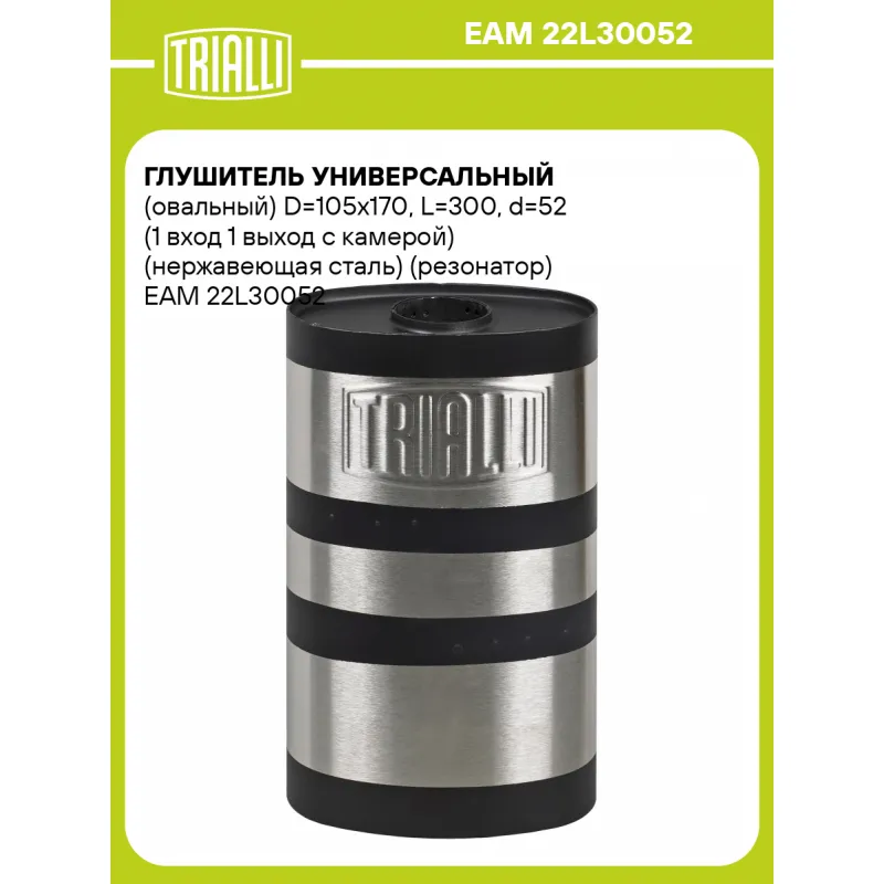 Глушитель универсальный (овальный) D=105x170, L=300, d=52 (1 вход 1 выход с камерой) (нержавеющая сталь) (резонатор) Характеристики: Артикул: EAM 22L30052 OEM номера: 22L30052 Особенности конструкции:: Набивка жаро-шумопоглощающая Гарантийный срок: 2 года/60 тыс. Количество на автомобиль: 1 Длина изделия (мм): 300 Форма изделия: Овал Диаметр корпуса D-1 (мм): 170 Диаметр корпуса D-2 (мм): 105 Диаметр трубы (мм): 52 Материал: Нержавеющая сталь AISI 201 Товарная линейка: BLACK Дополнительная информация: Этикетка изделия может отличаться от представленной на фото Комплектация: Глушитель универсальный (резонатор) - 1 шт Гарантия: от 1 года.