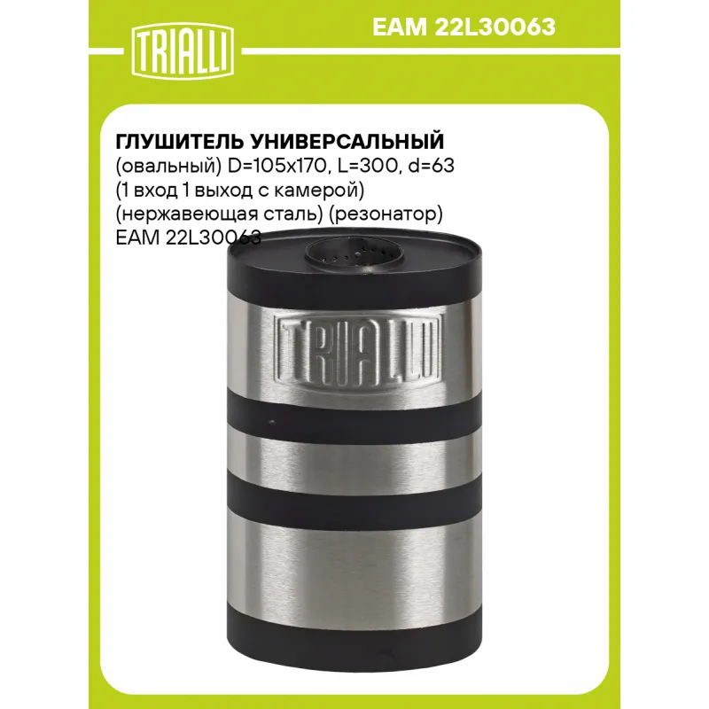 Глушитель универсальный (овальный) D=105x170, L=300, d=63 (1 вход 1 выход с камерой) (нержавеющая сталь) (резонатор) Характеристики: Артикул: EAM 22L30063 OEM номера: 22L30063 Особенности конструкции:: Набивка жаро-шумопоглощающая Гарантийный срок: 2 года/60 тыс. Количество на автомобиль: 1 Длина изделия (мм): 300 Форма изделия: Овал Диаметр корпуса D-1 (мм): 170 Диаметр корпуса D-2 (мм): 105 Диаметр трубы (мм): 63 Материал: Нержавеющая сталь AISI 201 Товарная линейка: BLACK Дополнительная информация: Этикетка изделия может отличаться от представленной на фото Комплектация: Глушитель универсальный (резонатор) - 1 шт Гарантия: от 1 года.