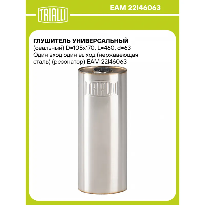 Глушитель универсальный (овальный) D=105x170, L=460, d=63 Один вход один выход (нержавеющая сталь) (резонатор) Характеристики: Артикул: EAM 22I46063 OEM номера: 22I46063 Особенности конструкции:: Набивка жаро-шумопоглощающая Гарантийный срок: 2 года/60 тыс. Количество на автомобиль: 1 Длина изделия (мм): 460 Форма изделия: Овал Диаметр корпуса D-1 (мм): 170 Диаметр корпуса D-2 (мм): 105 Диаметр трубы (мм): 63 Материал: Нержавеющая сталь AISI 201 Товарная линейка: BLACK Дополнительная информация: Этикетка изделия может отличаться от представленной на фото Комплектация: Глушитель универсальный (резонатор) - 1 шт Гарантия: от 1 года.