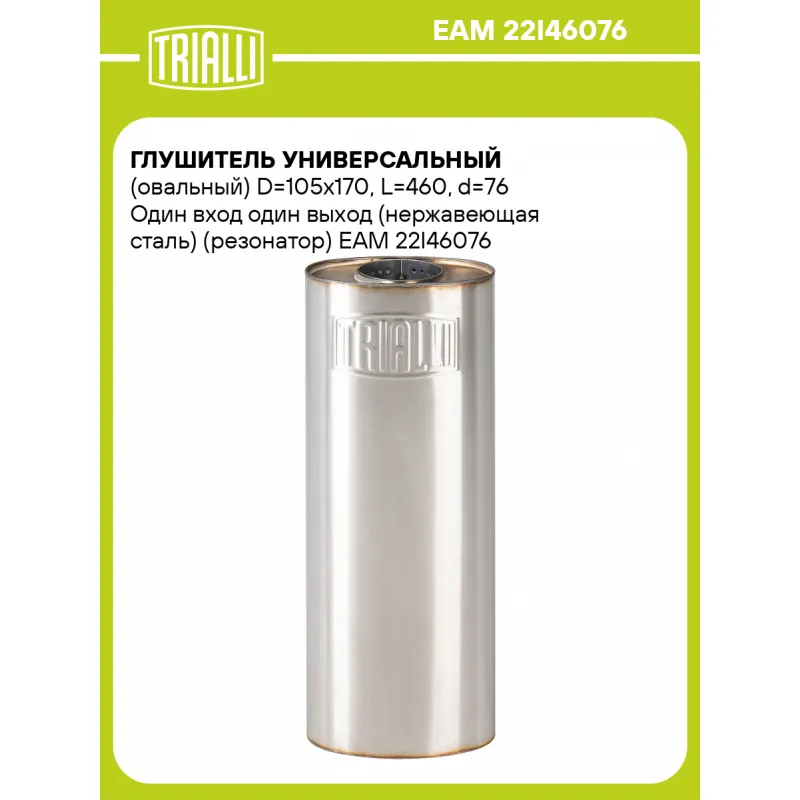 Глушитель универсальный (овальный) D=105x170, L=460, d=76 Один вход один выход (нержавеющая сталь) (резонатор) Характеристики: Артикул: EAM 22I46076 OEM номера: 22I46076 Особенности конструкции:: Набивка жаро-шумопоглощающая Гарантийный срок: 2 года/60 тыс. Количество на автомобиль: 1 Длина изделия (мм): 460 Форма изделия: Овал Диаметр корпуса D-1 (мм): 170 Диаметр корпуса D-2 (мм): 105 Диаметр трубы (мм): 76 Материал: Нержавеющая сталь AISI 201 Товарная линейка: BLACK Дополнительная информация: Этикетка изделия может отличаться от представленной на фото Комплектация: Глушитель универсальный (резонатор) - 1 шт Гарантия: от 1 года.