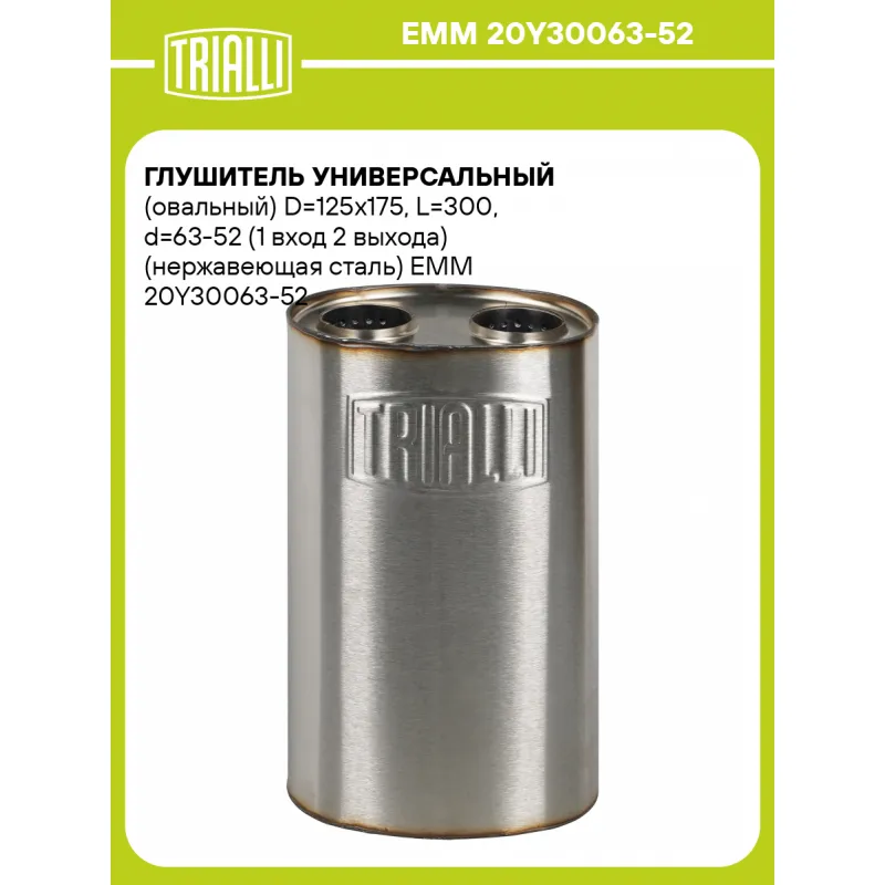 Глушитель универсальный (овальный) D=125x175, L=300, d=63-52 (1 вход 2 выхода) (нержавеющая сталь) Характеристики: Артикул: EMM 20Y30063-52 OEM номера: 20Y30063-52 Особенности конструкции:: Набивка жаро-шумопоглощающая Гарантийный срок: 2 года/60 тыс. Количество на автомобиль: 1 Длина изделия (мм): 300 Форма изделия: Овал Диамет... Читать полностью →
