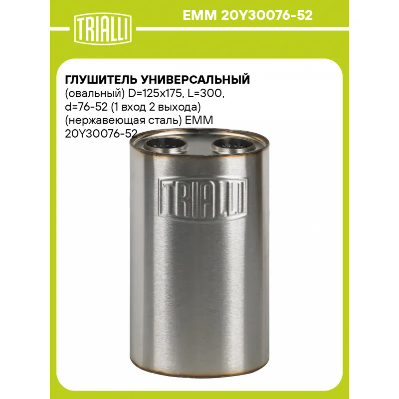 Глушитель универсальный (овальный) D=125x175, L=300, d=76-52 (1 вход 2 выхода) (нержавеющая сталь) Характеристики: Артикул: EMM 20Y30076-52 OEM номера: 20Y30076-52 Особенности конструкции:: Набивка жаро-шумопоглощающая Гарантийный срок: 2 года/60 тыс. Количество на автомобиль: 1 Длина изделия (мм): 300 Форма изделия: Овал Диамет... Читать полностью →