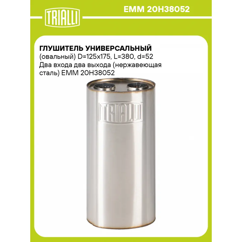 Глушитель универсальный (овальный) D=125x175, L=380, d=52 Два входа два выхода (нержавеющая сталь) Характеристики: Артикул: EMM 20H38052 OEM номера: 20H38052 Особенности конструкции:: Набивка жаро-шумопоглощающая Гарантийный срок: 2 года/60 тыс. Количество на автомобиль: 1 Длина изделия (мм): 380 Форма изделия: Овал Диаметр корпуса D-1 (мм): 175 Диаметр корпуса D-2 (мм): 125 Диаметр трубы (мм): 52 Материал: Нержавеющая сталь AISI 201 Товарная линейка: BLACK Дополнительная информация: Этикетка изделия может отличаться от представленной на фото Комплектация: Глушитель универсальный - 1 шт Гарантия: от 1 года.