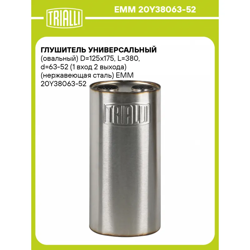Глушитель универсальный (овальный) D=125x175, L=380, d=63-52 (1 вход 2 выхода) (нержавеющая сталь) Характеристики: Артикул: EMM 20Y38063-52 OEM номера: 20Y38063-52 Особенности конструкции:: Набивка жаро-шумопоглощающая Гарантийный срок: 2 года/60 тыс. Количество на автомобиль: 1 Длина изделия (мм): 380 Форма изделия: Овал Диамет... Читать полностью →
