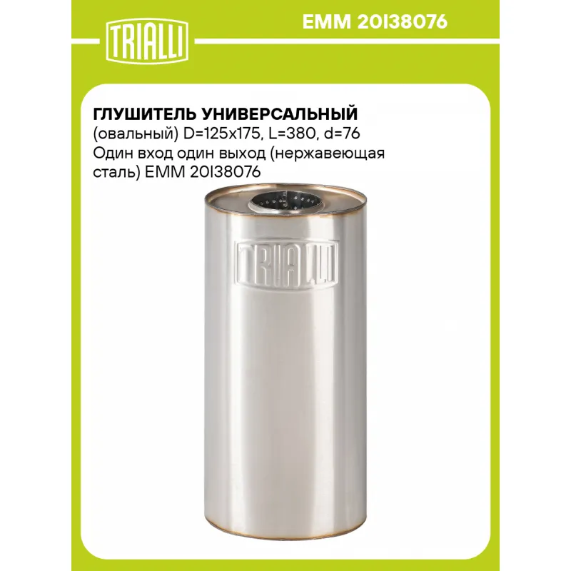 Глушитель универсальный (овальный) D=125x175, L=380, d=76 Один вход один выход (нержавеющая сталь) Характеристики: Артикул: EMM 20I38076 OEM номера: 20I38076 Особенности конструкции:: Набивка жаро-шумопоглощающая Гарантийный срок: 2 года/60 тыс. Количество на автомобиль: 1 Длина изделия (мм): 380 Форма изделия: Овал Диаметр корпуса D-1 (мм): 175 Диаметр корпуса D-2 (мм): 125 Диаметр трубы (мм): 76 Материал: Нержавеющая сталь AISI 201 Товарная линейка: BLACK Дополнительная информация: Этикетка изделия может отличаться от представленной на фото Комплектация: Глушитель универсальный - 1 шт Гарантия: от 1 года.