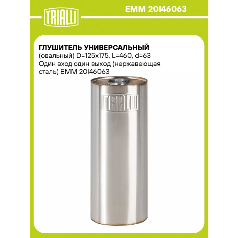 Глушитель универсальный (овальный) D=125x175, L=460, d=63 Один вход один выход (нержавеющая сталь) Характеристики: Артикул: EMM 20I46063 OEM номера: 20I46063 Особенности конструкции:: Набивка жаро-шумопоглощающая Гарантийный срок: 2 года/60 тыс. Количество на автомобиль: 1 Длина изделия (мм): 460 Форма изделия: Овал Диаметр корпуса D-1 (мм): 175 Диаметр корпуса D-2 (мм): 125 Диаметр трубы (мм): 63 Материал: Нержавеющая сталь AISI 201 Товарная линейка: BLACK Дополнительная информация: Этикетка изделия может отличаться от представленной на фото Комплектация: Глушитель универсальный - 1 шт Гарантия: от 1 года.
