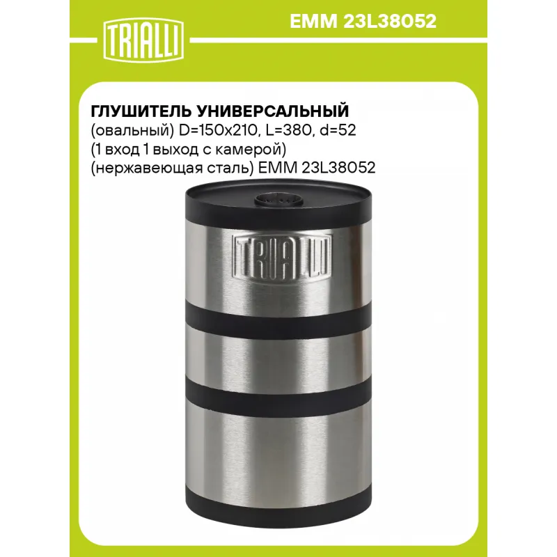 Глушитель универсальный (овальный) D=150x210, L=380, d=52 (1 вход 1 выход с камерой) (нержавеющая сталь) Характеристики: Артикул: EMM 23L38052 OEM номера: 23L38052 Особенности конструкции:: Набивка жаро-шумопоглощающая Гарантийный срок: 2 года/60 тыс. Количество на автомобиль: 1 Длина изделия (мм): 380 Форма изделия: Овал Диамет... Читать полностью →