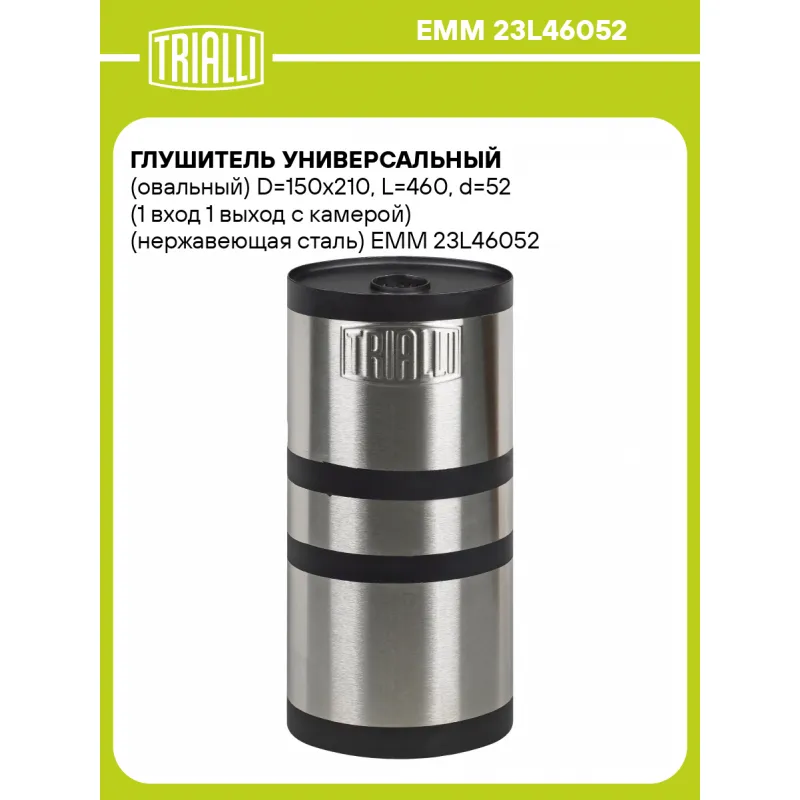 Глушитель универсальный (овальный) D=150x210, L=460, d=52 (1 вход 1 выход с камерой) (нержавеющая сталь) Характеристики: Артикул: EMM 23L46052 OEM номера: 23L46052 Особенности конструкции:: Набивка жаро-шумопоглощающая Гарантийный срок: 2 года/60 тыс. Количество на автомобиль: 1 Длина изделия (мм): 460 Форма изделия: Овал Диамет... Читать полностью →
