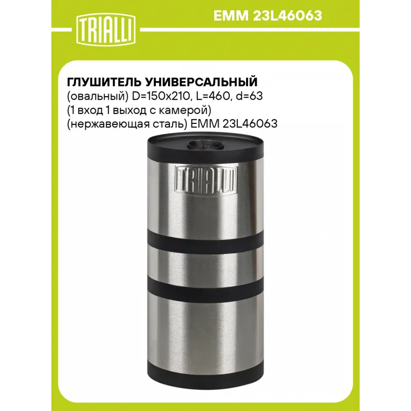 Глушитель универсальный (овальный) D=150x210, L=460, d=63 (1 вход 1 выход с камерой) (нержавеющая сталь) Характеристики: Артикул: EMM 23L46063 OEM номера: 23L46063 Особенности конструкции:: Набивка жаро-шумопоглощающая Гарантийный срок: 2 года/60 тыс. Количество на автомобиль: 1 Длина изделия (мм): 460 Форма изделия: Овал Диамет... Читать полностью →