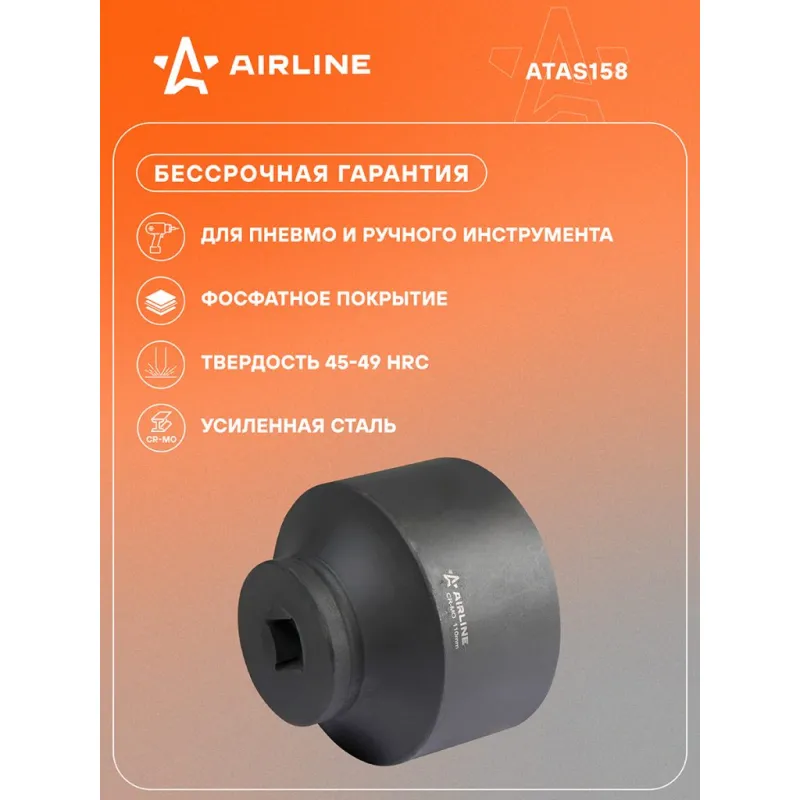 Головка ударная торцевая 1"DR шестигранная 110мм, L=120мм Описание: Головка ударная торцевая 1" DR шестигранная ATAS158 бренда AIRLINE Головка рассчитана на использование совместно с пневматическим гайковёртом и усилителем крутящего момента. - Материал - сталь 42CrMo; - Твердость - 45-49 HRC; - Покрытие - фосфатирование; - Материал обеспечивает стойкость к высоким нагрузкам. - Ударные головки для гайковерта, электроинструмента, пневмогайковерта, ручного инструмента и шуруповерта облегчат выполняемые задач. - В корпусе есть сквозное отверстие под штифт. Применение головки: при сборке и разборке узлов автомобиля, для монтажа и демонтажа колес легковых и грузовых автомобилей, в шиномонтажах, автосервисе, СТО. Рекомендуется для профессионального использования. Ударная торцевая головка дополнит набор инструментов для автомобиля который удобно хранить в багажнике машины, гараже, дома, а также легко транспортировать. Ударные головки значительно облегчают ремонт автомобиля и сокращают затраченное время на работу. Профессиональный набор инструментов для автомобиля, дома это отличный вариант для подарка мужчине, мужу, дедушке, автомобилисту, на день рождения, новый год, 23 февраля и без повода. Характеристики: Артикул: ATAS158 Присоединительный квадрат: 1" Размер,мм: 110 Длина,мм: 120 Комплектация: Головка - 1 шт Гарантия: от 1 года.