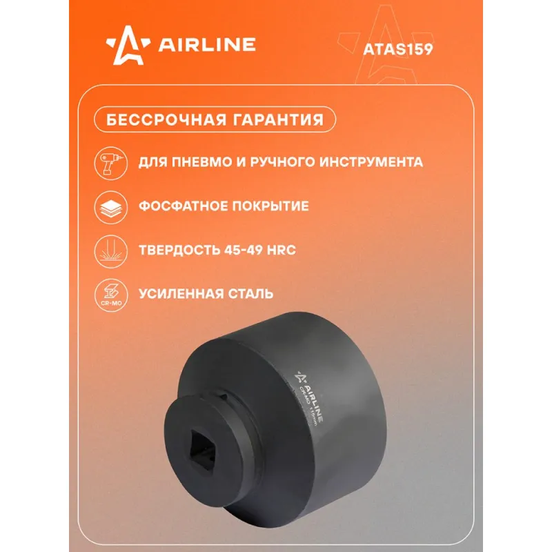 Головка ударная торцевая 1"DR шестигранная 115мм, L=120мм Описание: Головка ударная торцевая 1" DR шестигранная ATAS159 бренда AIRLINE Головка рассчитана на использование совместно с пневматическим гайковёртом и усилителем крутящего момента. - Материал - сталь 42CrMo; - Твердость - 45-49 HRC; - Покрытие - фосфатирование; - Материал обеспечивает стойкость к высоким нагрузкам. - Ударные головки для гайковерта, электроинструмента, пневмогайковерта, ручного инструмента и шуруповерта облегчат выполняемые задач. - В корпусе есть сквозное отверстие под штифт. Применение головки: при сборке и разборке узлов автомобиля, для монтажа и демонтажа колес легковых и грузовых автомобилей, в шиномонтажах, автосервисе, СТО. Рекомендуется для профессионального использования. Ударная торцевая головка дополнит набор инструментов для автомобиля который удобно хранить в багажнике машины, гараже, дома, а также легко транспортировать. Ударные головки значительно облегчают ремонт автомобиля и сокращают затраченное время на работу. Профессиональный набор инструментов для автомобиля, дома это отличный вариант для подарка мужчине, мужу, дедушке, автомобилисту, на день рождения, новый год, 23 февраля и без повода. Характеристики: Артикул: ATAS159 Присоединительный квадрат: 1" Комплектация: Головка - 1 шт Гарантия: от 1 года.